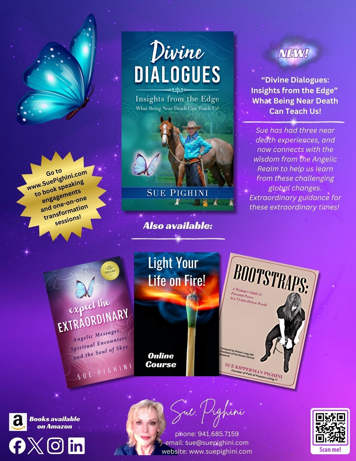 Sue’s first two books, “Bootstraps” and “Expect the Extraordinary”, are best sellers in workshop venues around country where she speaks and leads programs on finding your life’s passion and purpose. Her third book, “Divine Dialogues” highlights the angelic wisdom received through horses over the last 20 years but especially during the Covid lockdown.